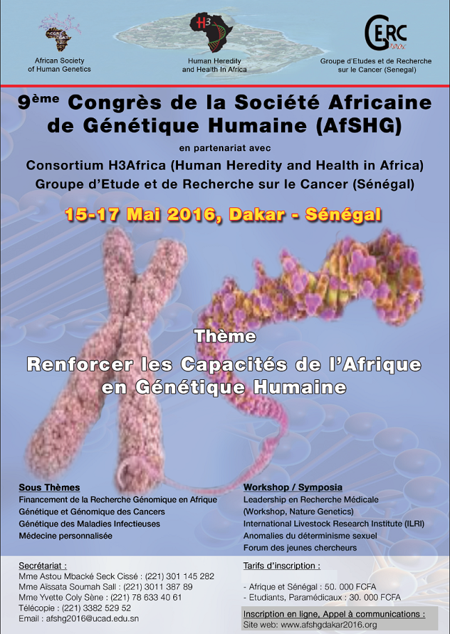 La société Africaine de Génétique Humaine (African Society of Human Genetics) va organiser son Congrès, le neuvième, pour la première fois au Sénégal, pays francophone, du 15 au 17 Mai 2016, avec comme partenaire le consortium H3Africa (Human Heredity and Health in Africa) qui, conjointement, organisera une de ses rencontres annuelles.