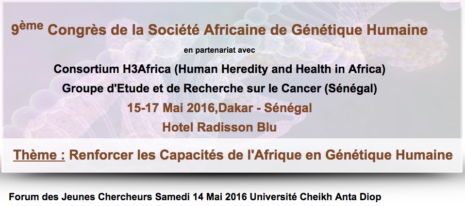 La société Africaine de Génétique Humaine (African Society of Human Genetics) va organiser son Congrès, le neuvième, pour la première fois au Sénégal, pays francophone, du 15 au 17 Mai 2016, avec comme partenaire le consortium H3Africa (Human Heredity and Health in Africa) qui, conjointement, organisera une de ses rencontres annuelles.